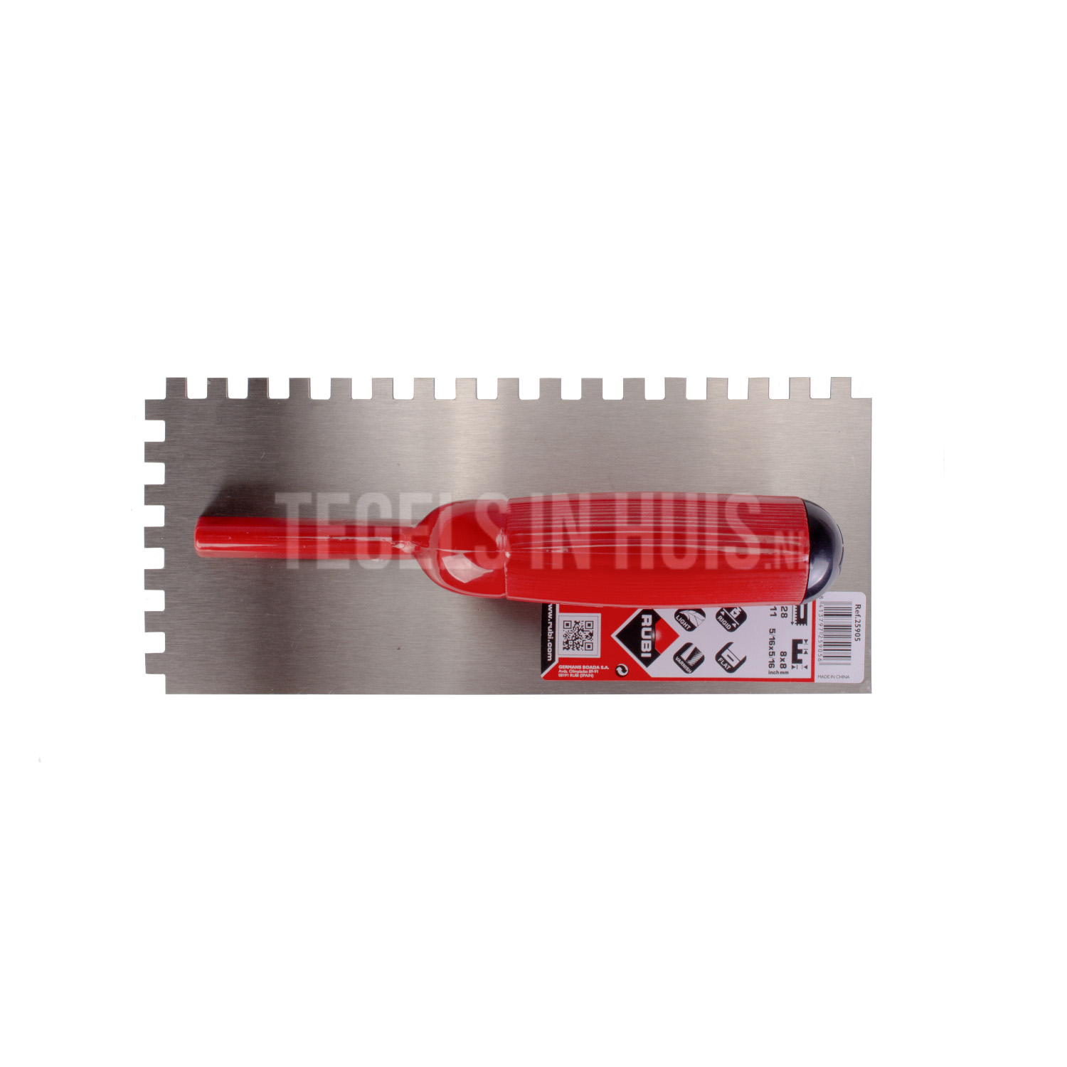 Voor het gelijkmatig aanbrengen van uw tegellijm. Een 8 mm lijmspaan wordt vaak gebruikt voor wand- en vloertegels tussen de 20×25 cm en 30×60 cm.