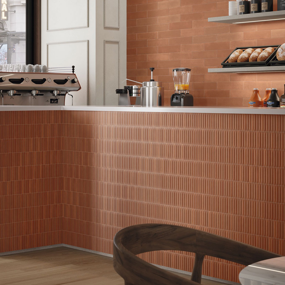 Wandtegel Terre in de kleur tandoori terracotta geeft elke ruimte een warme, zonnige sfeer. De diepe terracottakleur doet denken aan een zomerse avond en zorgt meteen voor een gezellig gevoel. De tegel is gemaakt van sterk keramiek, waardoor hij lang meegaat en weinig onderhoud nodig heeft. Je kunt hem gebruiken in de keuken, badkamer of in een ander leuk woonproject. De verschillende uitvoeringen passen mooi bij elkaar en zijn makkelijk te combineren. Zo maak je je muur precies zoals jij het wilt. De voeglijnen van kitkat tegel Terre kun je meevoegen in een kleur naar keuze.